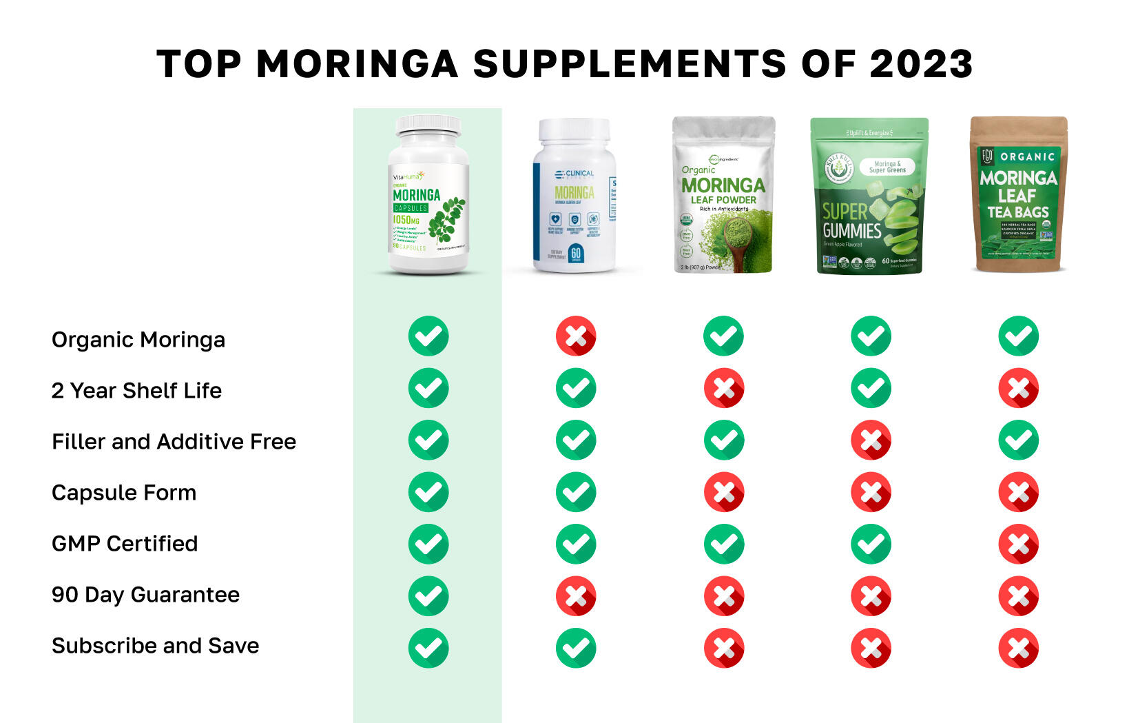 VitaHuman Premium Moringa is superior in value, quality, and dosage. That provides organic materials in a healthy dosage of 1200 mgs per serving.Premium Moringa ensures the highest concentration of vitamins and minerals, which in turn increases the probability of health benefits - especially in the skin, waistline, gut, lungs, and joints.We also found customer reviews showing long-term effects. They have an easy-to-access phone order and text system to help with online orders or subscriptions. And their USA customer service answered within 2 hours.These unique moringa capsules are ideal vs other brands because they are portable, easy to take, and incredibly nutrient dense.They also have free shipping on almost everything. Click LEARN MORE to receive promotional pricing as low as $26/bottle.
